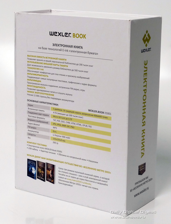 Начнём наш обзор с традиционного описания комплекта поставки. Коробка, в которую упакована читалка, хорошо оформлена. На откидывающейся крышке с магнитиками в качестве замка нанесена фотография устройства анфас. На обратной стороне коробки приведено краткое описание возможностей устройства и его технически характеристики. Попутно потенциальному покупателю дважды сообщают, что в подарок он получит ни много ни мало целых три книги серии «Метро 2033», которые предзагружены в память ридера. Сама читалка покоится внутри коробки в отдельном лотке, который покрыт изнутри вспененным пластиком для лучшей сохранности устройства.
